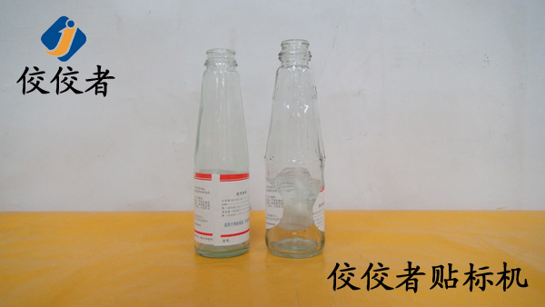 將玻璃瓶放到貼標(biāo)機(jī)上,隨著瓶子的轉(zhuǎn)動便被貼上了標(biāo)簽,如下圖: