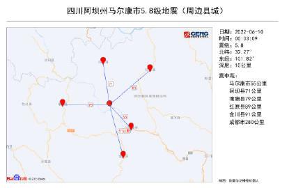 中國(guó)地震臺(tái)網(wǎng)正式測(cè)定:06月10日00時(shí)03分在四川阿壩州馬爾康市發(fā)生5.8級(jí)地震,震源深度10千米。