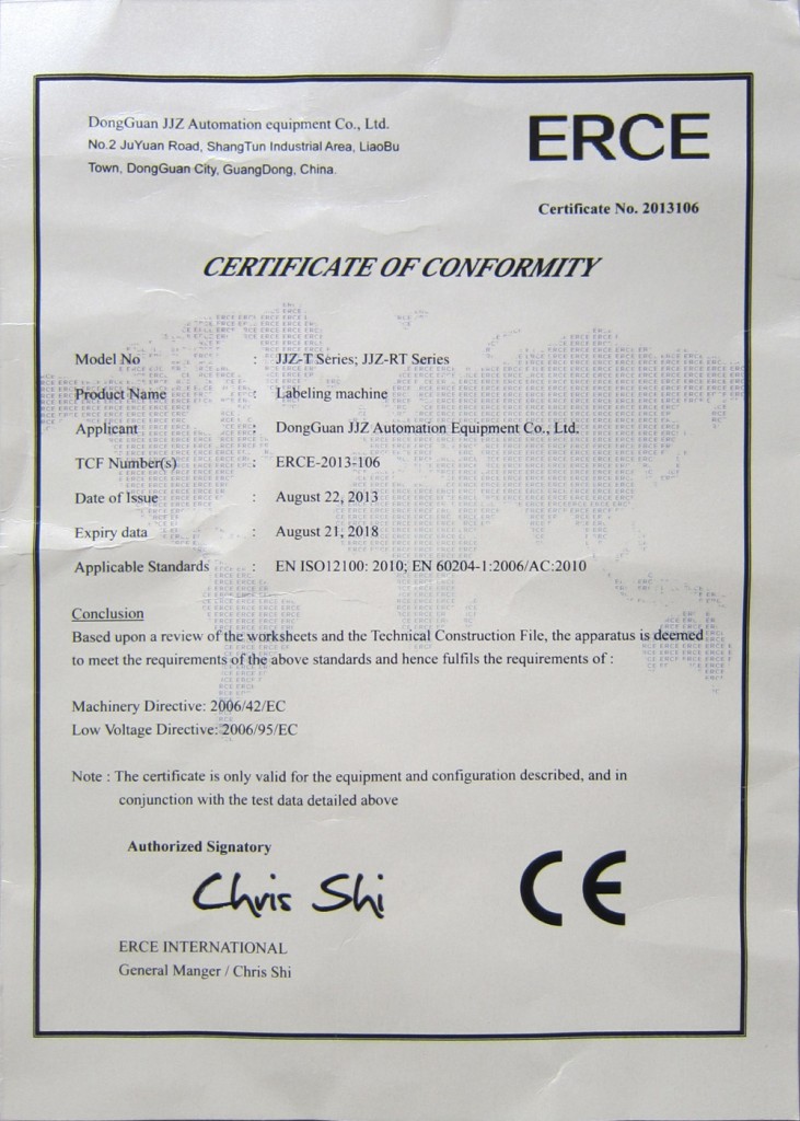 為使公司產(chǎn)品盡快進軍歐洲市場,擴大出口業(yè)務,并提升我司對國際市場產(chǎn)品質(zhì)量的要求。通過努力,高臻智能公司旗下不干膠貼標機及熱熔膠貼標機系列產(chǎn)品已于2013年8月順利通過了CE認證。獲得得了認證產(chǎn)品的CE認證《符合性證書》及相關測試報告。為公司主導產(chǎn)品全面開拓歐洲市場提供了可靠的保障。