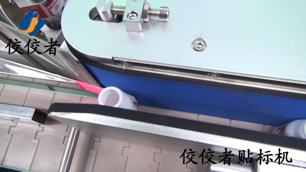 上圖展示的是操作人員將需要貼標(biāo)的小圓瓶放到設(shè)備的輸送線上,輸送至剝標(biāo)板出標(biāo)位置,此前有一個(gè)步驟在圖片中沒有展示出來,就是緊靠在一起的小圓瓶在經(jīng)過設(shè)備前段的分瓶輪時(shí),間距會(huì)均勻拉開,貼標(biāo)時(shí)彼此不受干涉;